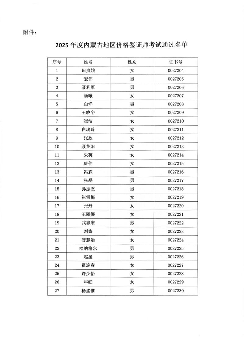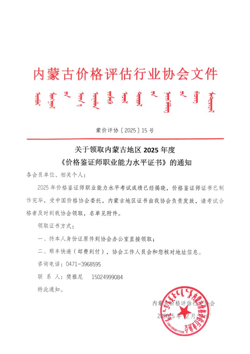 关于领取内蒙古地区2025年度《价格鉴证师职业能力水平证书》的通知